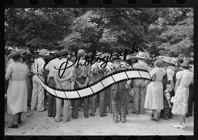 Title: Farm people eating watermelon on lawn in front of courthouse, Tahlequah, Oklahoma