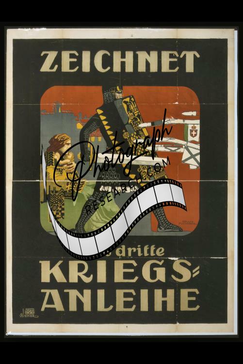 Summary: Poster shows a classical figure, with arms raised, holding a sword. The figure is surrounded by drowning people and in the background the oceanliner Lusitania is sinking.
