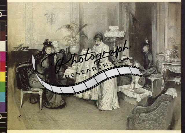 Woman holding up wedding dress in front of maid,ladies,William Thomas Smedley