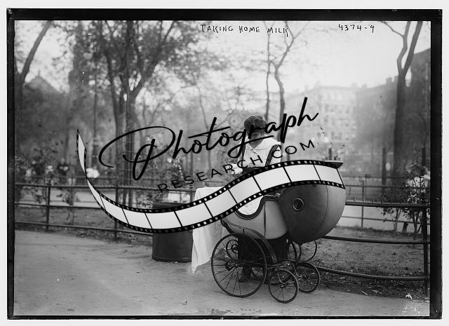 Taking home milk,woman carrying milk bottles,stroller,baby,Bain News Service