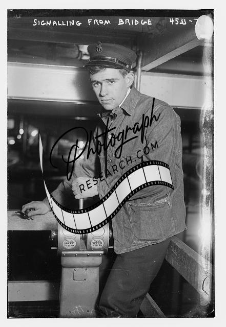 Signalling from bridge,man,Bain News Service,holding tobacco pipe