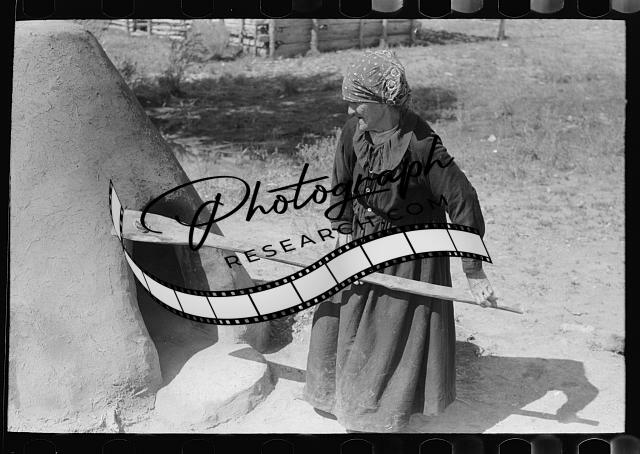 Title: Spanish-American woman putting loaf of bread into oven, Taos County, New Mexico
