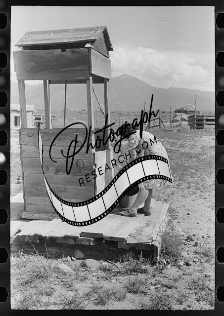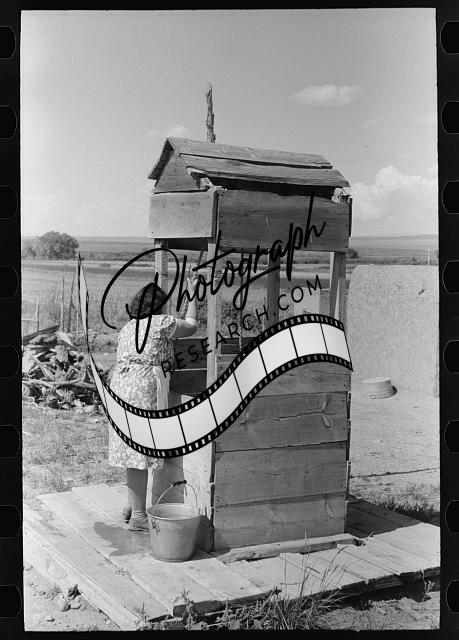 Title: Daughter of Spanish-American farm family drawing water at the well, Taos County, New Mexico