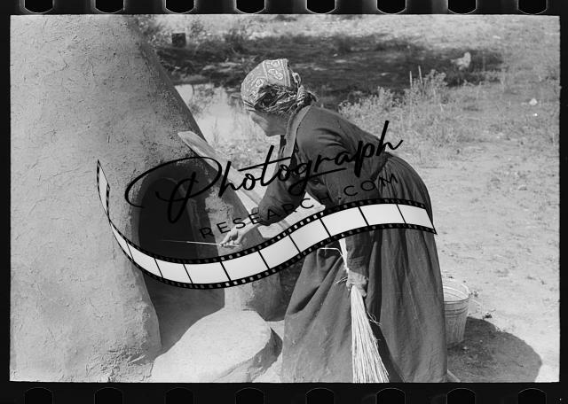 Title: Spanish-American woman testing temperature of earthen oven by determining length of time required to scorch wool, Taos County, New Mexico