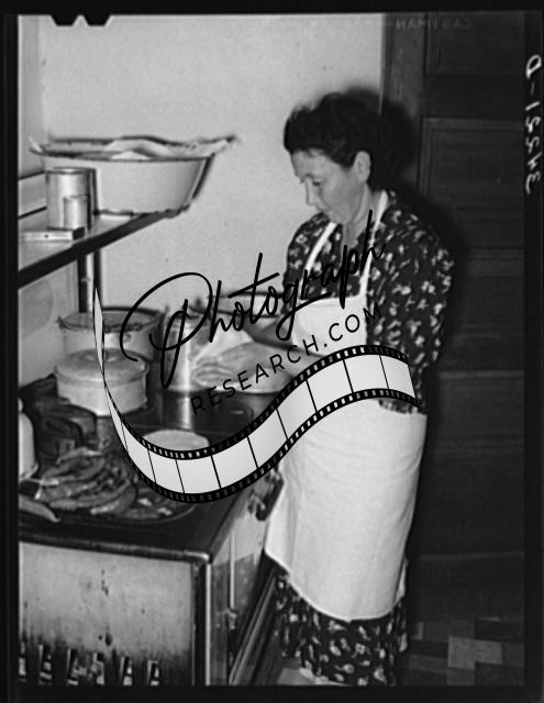 Title: Spanish-American woman removing peppers from stove. Taos, New Mexico