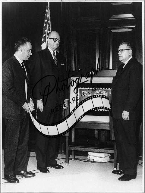 Dedication of stamp to Mrs. Roosevelt with James Roosevelt and Postmaster General