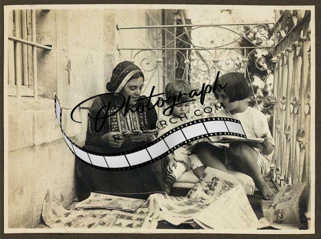 Arab woman seated with boy & girl,Anna Spafford Baby Home,looking at comics