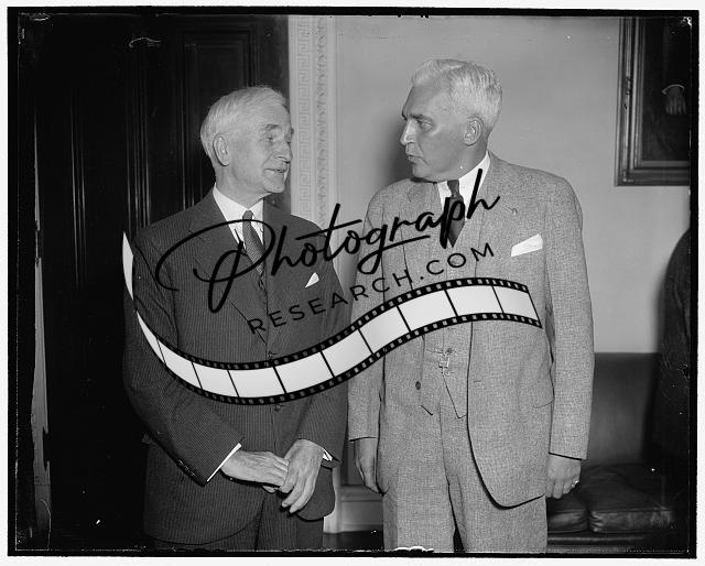 Title: Testify before Senate Relief Committee. Washington, D.C., Mar. 7. Roy Franklin, left, business agent for Local #183, United Packing House Workers, and Ernest B. Jacobs, Pres. Of the same union, Austin, Minn. testified before the Senate Relief Committee today, both employees of the Hormel Packing Plant, said Franklin, that the workers felt that the management had made no effort to increase the amount of work to be done in a 40-hour budget because the workers in a previous period had completed and budgeted work in les than the allotted time, 3/7/38