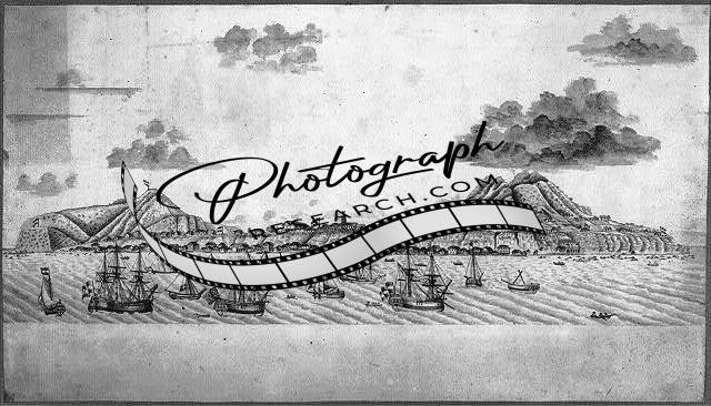 Ships in harbor of unidentified island; French flag is prominent,c1830,shoreline