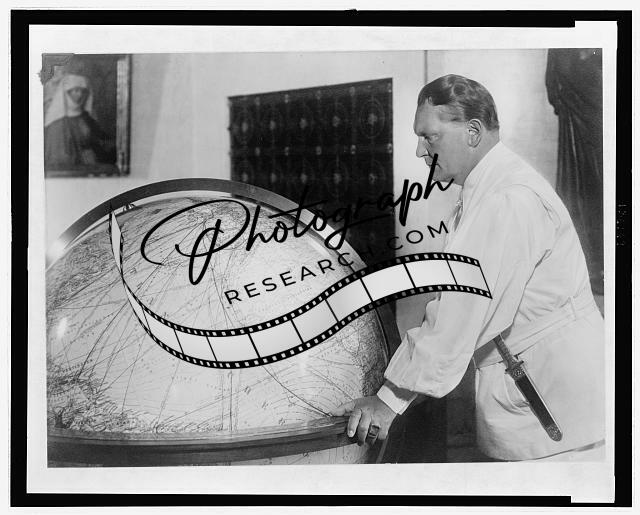 Hermann Göring, three-quarter length portrait, facing left, looking at a large globe