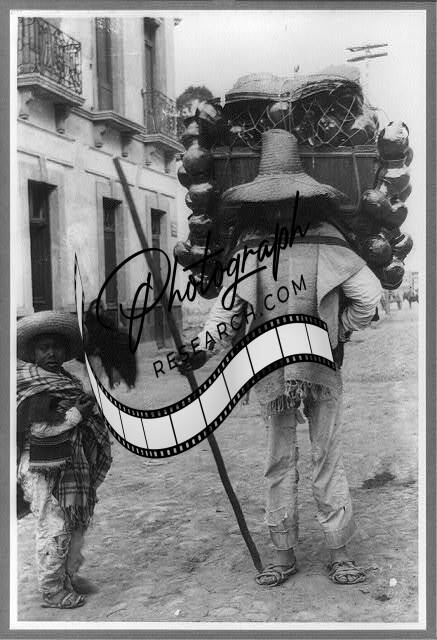 Seller of water bottles,Mexico City,Mexico,man carrying load of pottery jars?