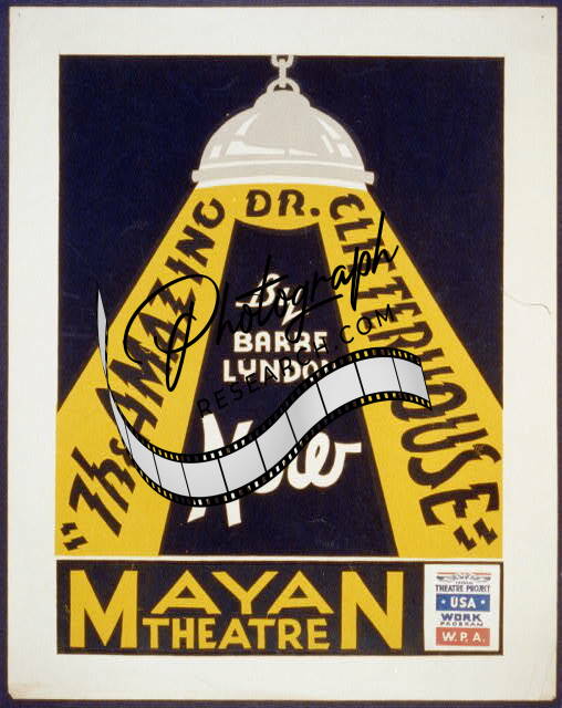 Summary: Poster for Federal Theatre Project presentation of 'The Amazing Dr. Clitterhouse' at the Hollywood Playhouse, showing light from a suspended lamp.