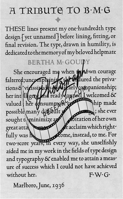 A tribute to B.M.G.,Frederick Goudy,Bertha M Goudy,Bertham,June 1936