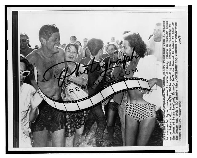 President John F. Kennedy is surrounded by a crowd as he comes out of the water onto the beach behind Peter Lawford's Santa Monica home