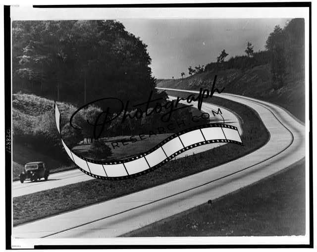 Automobile on sweeping curves of Autobahn,Countryside,Germany,Highway,c1937