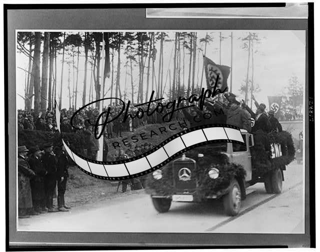 Men standing in the back of a truck salute Hermann Göring and others during inaugural ceremonies for the newly opened Autobahn