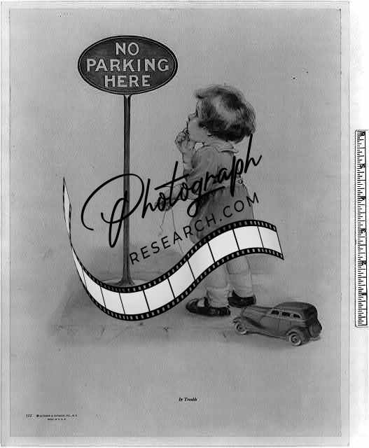In trouble,small child pulling toy car,looking at no parking here sign,July 1942