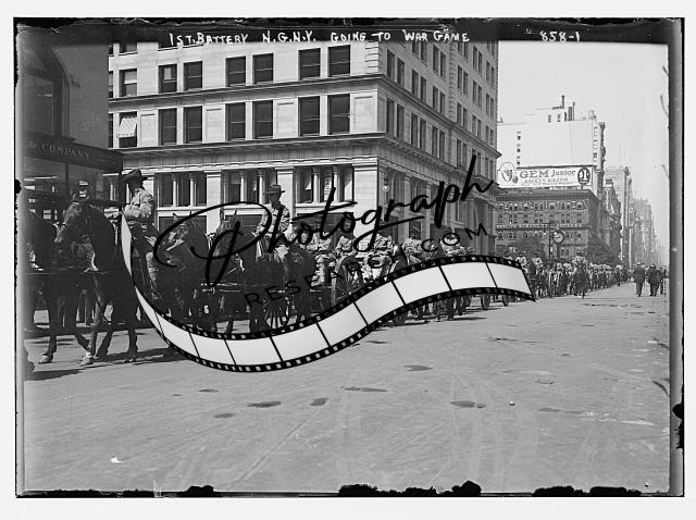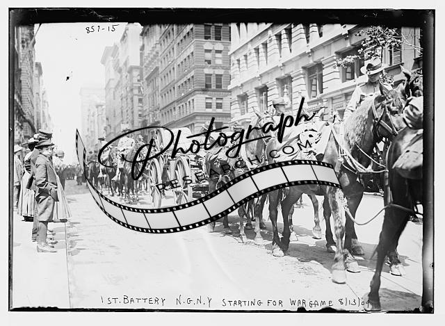 1st Battery,in carts,on horse-back,starting for war game,New York,NY,August 1909