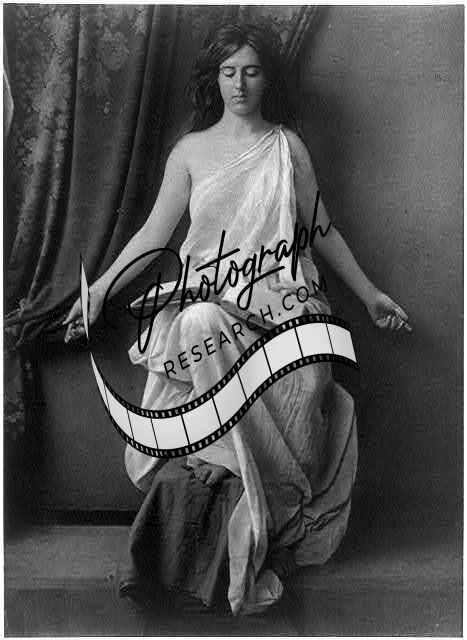 Woman seated, full lgth., facing front, with book on her lap and her hands out to her sides
