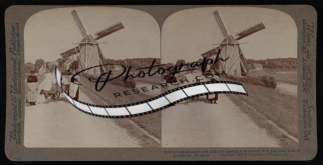 Industrious peasants and milk-cart passing a windmill on a dike road west of Dor