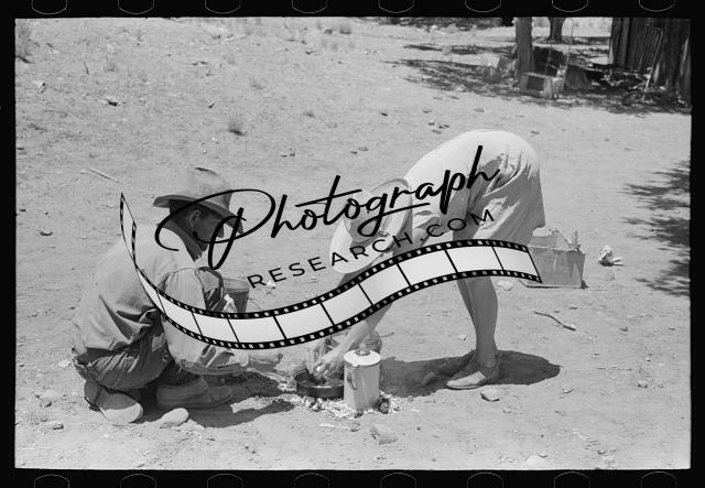 Title: The Caudill family eating dinner in the open the day thew were moving their dugout. Pie Town, New Mexico