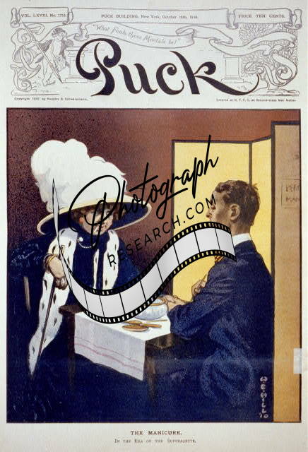 The manicure,in the era of the suffragette,Puck,c1910,fancy woman,cigarette,man