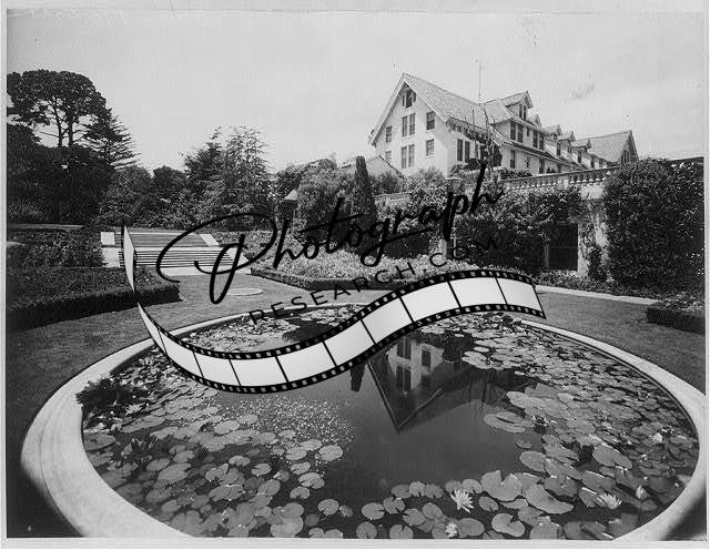 Lily pond,garden with Hotel Del Monte in background,Del Monte,California,CA
