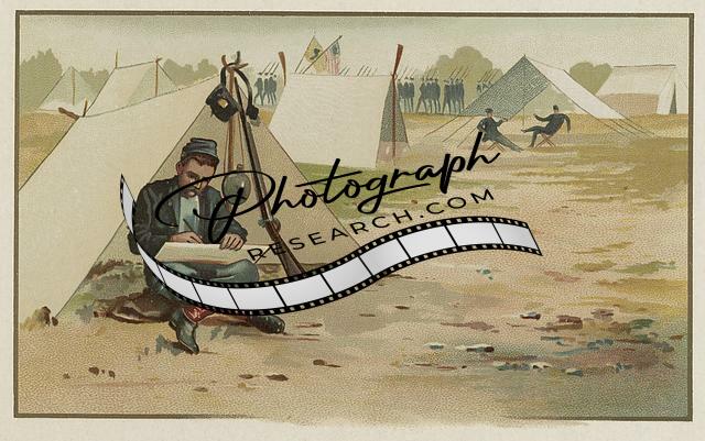 Union Soldier drawing while sitting in front of tent,army camp,c1888,Civil War