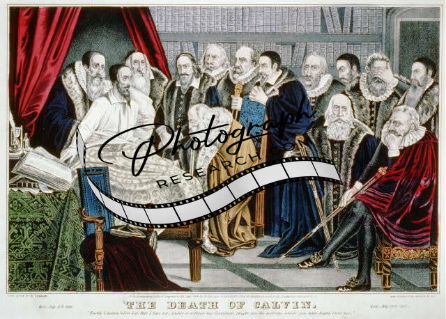 The Death of Calvin,Jean Calvin,1509-1564,N. Currier,Men Gathered