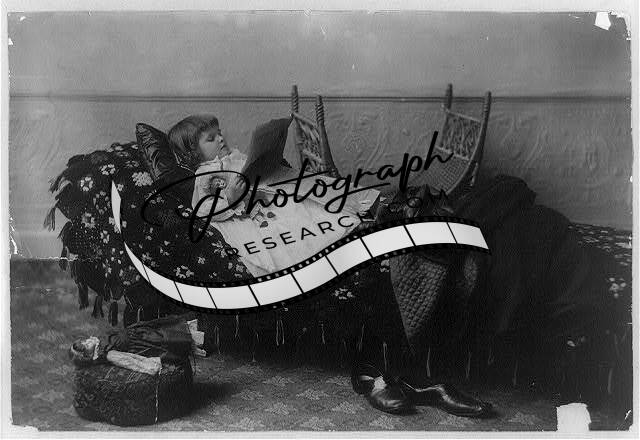 Papa reads this way,c1800's,girl lying on sofa looking at newspaper,dolls,shoes