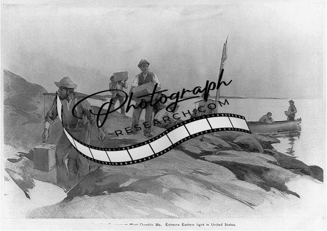 Men unloading supplies,lighthouse,West Quoddy,Maine