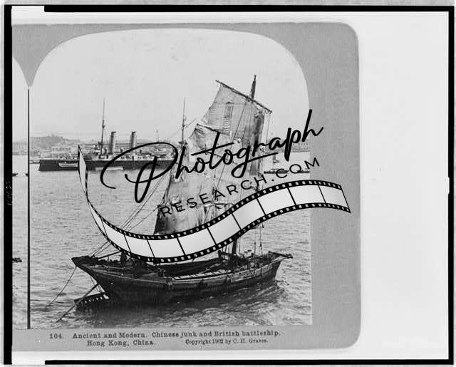 Ancient,modern--Chinese junk,British battleship,Hong Kong,China,c1902,Graves
