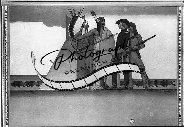 U.S. Cavalry officer talking with 2 Indians; guide and buffalo herd in background