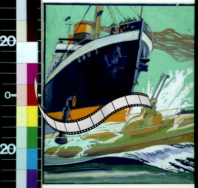 Submarine passing the bow of a ship,1915?,Edward Penfield,Naval,Boat