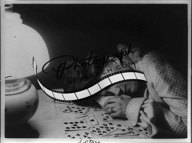 Solitary,Young Woman,Sleeping,Head on Table,Playing Cards,c1904,Lamp