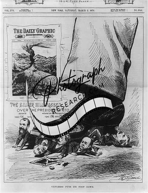 Congress puts its foot down,Silver Bill passed,1878,Cartoon,Congress,Senate,Veto