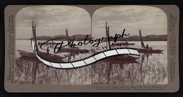 Fishing boats coming home at sunset--west across Tamagawa to Kawasaki, near Yokohama, Japan