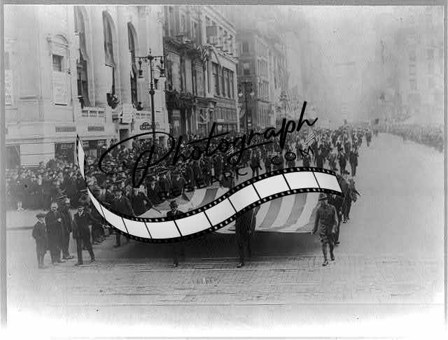 New York City - Parade,Men carrying large U.S. flag down the street,1916?