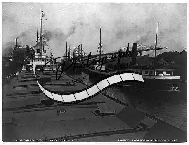 Unloading at ore docks,Cleveland,c1900,Boats,flag?