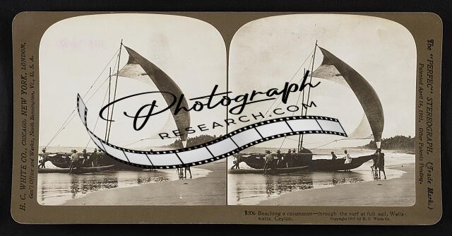 Beaching a catamaran--through the surf at full sail, Wellawatta, Ceylon