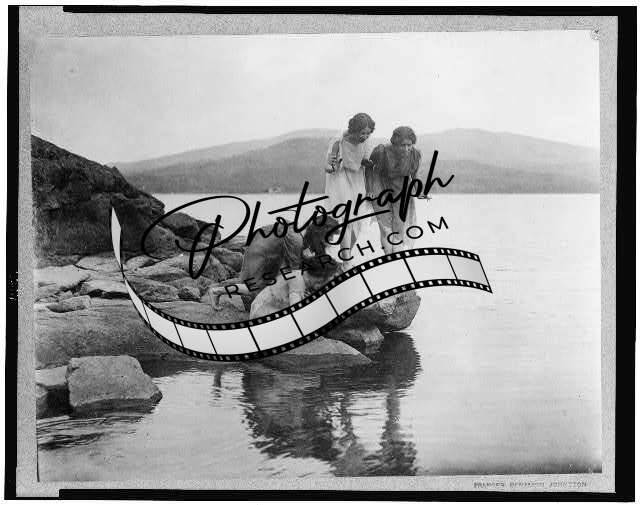 Four figures,water edge,women,clothing,dress,sheer clothing,pool,lake,c1914