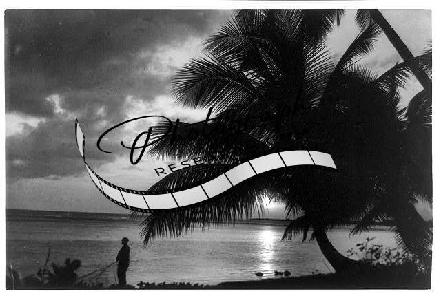 Palm Tree,Fisherman with net standing by shoreline,Puerto Rico,Sunset,c1920