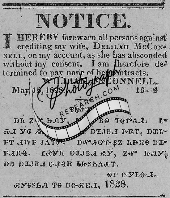 Bilingual notice,English,Cherokee,Delilah McConnell,1828,wife left husband,debts