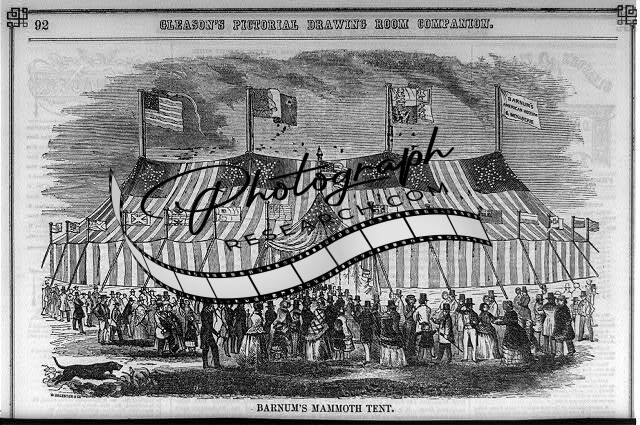 P.T. Barnum's mammoth tent,1851,Gleason's Pictorial,flags,crowd,Circus