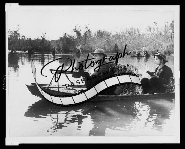 Viet Cong guerrillas in small boats patrol the Saigon River in South Vietnam