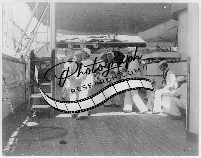 Sailors dancing with each other aboard USS OLYMPIA,deck,steps,fun,uniforms,1899
