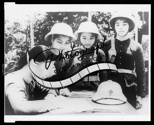 Hanoi, North Vietnam - three young women look on as another "signs up"