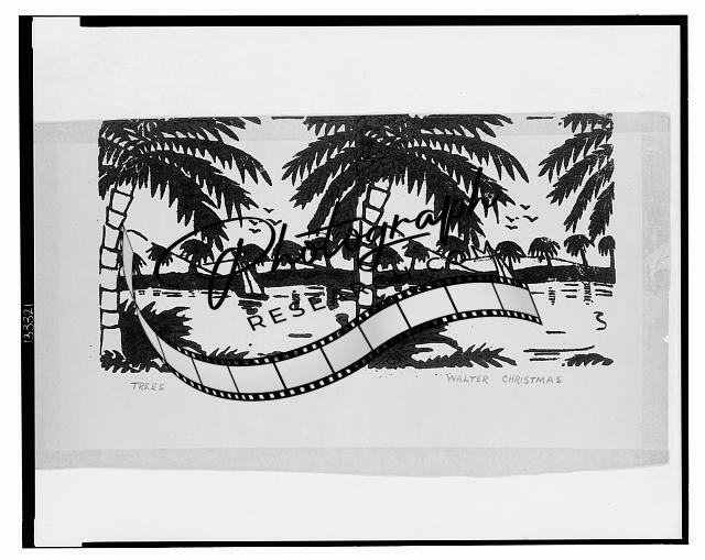 Trees, Print showing a seascape with palm trees, water, sailboats, and mountains in the background. , Christmas, Walter, artist