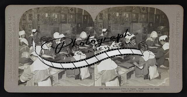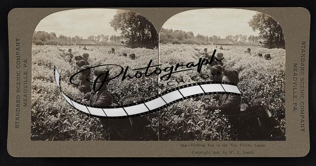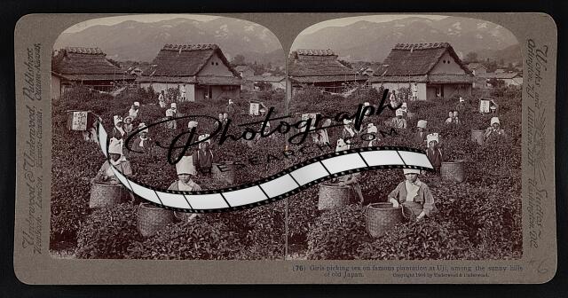 Girls picking tea on famous plantation at Uji, among the sunny hills of old Japan