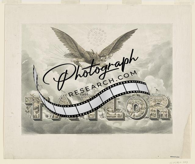 Summary: A commemorative print published after the inauguration of President James K. Polk. The design incorporates oval bust portraits of the eleven Presidents arranged in an oval with Washington in the center and Polk at the bottom. Washington's portrait is adorned with flags and military trophies and surrounded by medallions with the arms of twenty-six states. At the top-center of the lower half are listings of dates of birth, inauguration, retirement, and, when applicable, dates of death, for each President. In the corners of the print are female figures personifying (clockwise from upper left): Peace and Plenty, Industry and Prosperity (a woman scattering coins), Liberty, and Justice. Throughout, the entire image is an ornamental scrollwork of floral and acanthus design. The lithograph was printed in two sections, an upper and a lower half, on two sheets of paper.